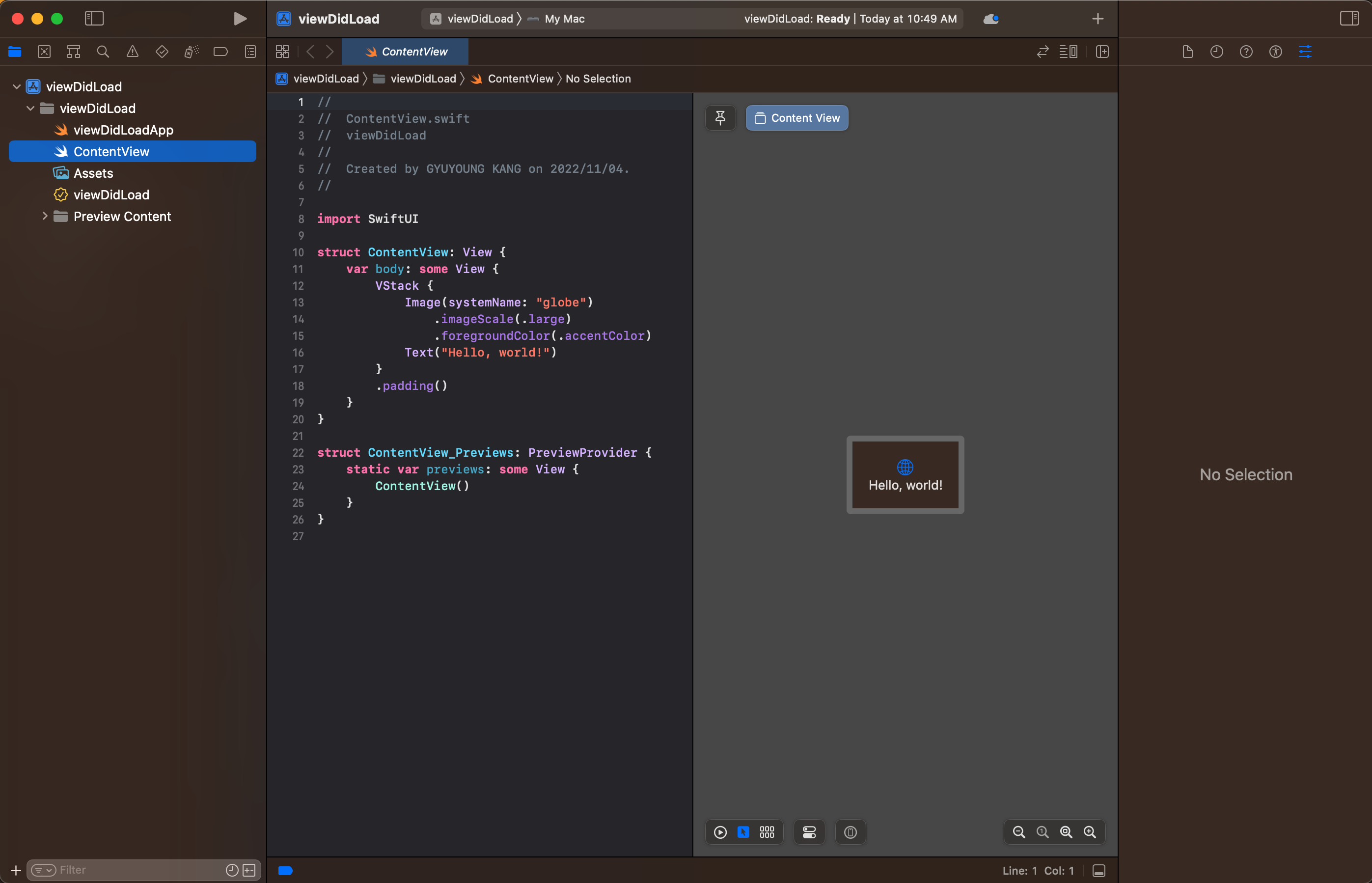 이제, 우리는 SwiftUI 프로젝트 코드의 View 에서 onViewDidLoad 를 사용 할 수 있게 되었는데요. 한번 사용해 볼께요.